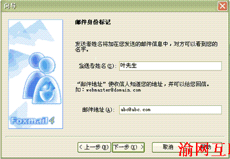 4.點(diǎn)擊下一步彈出以下窗口,填寫發(fā)送者姓名(如張先生)及郵箱地址(如:abc@abc.com)