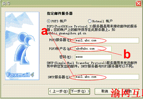 5.點(diǎn)擊下一步彈出以下窗口,在a處填入"mail.abc.com",在b處填入您的整個(gè)郵箱地址